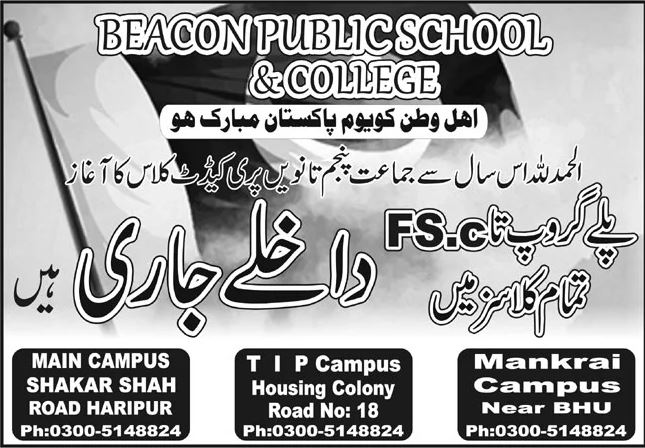 Beacon Public School & College is pleased to announce that admissions 2026 are now open for all classes for the 2026 academic session. On the occasion of Pakistan Day, the institution extends warm wishes to all citizens and invites parents to enroll their children in a prestigious and high-quality learning environment.