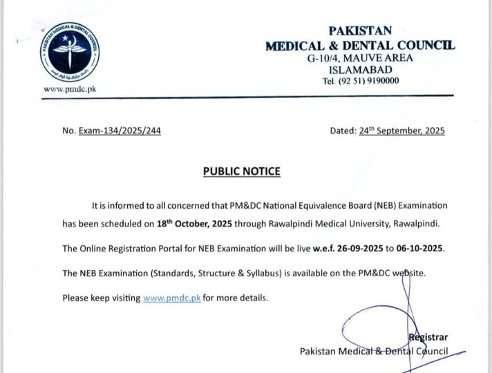 The candidates will carry out their registration with the NEB through the online portal from 26-09-2025 to 06-10-2025. The NEB exams with standards, structure and syllabus is made available on the official website of PMDC. The candidates can get more details of this exam from the official website of PMDC.