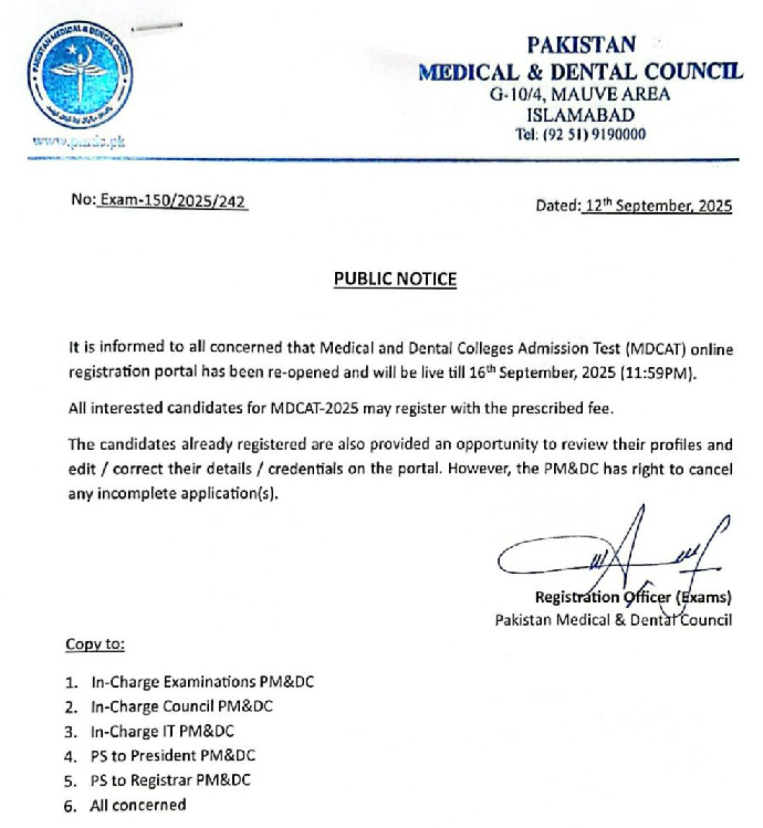 The Medical and Dental College Admission Test MDCAT for 2025 has been rescheduled owing to the severe flood situation affecting several regions of the country, as per Official PMDC Schedule. Acting on the directions of Health Minister Mustafa Kamal, the Federal Ministry of Health, in coordination with the Pakistan Medical and Dental Council PMDC, has released a new timetable for the exam. The students can get fresh updates of MDCAT 2025 Exam Postponed Due to Flood Emergency.