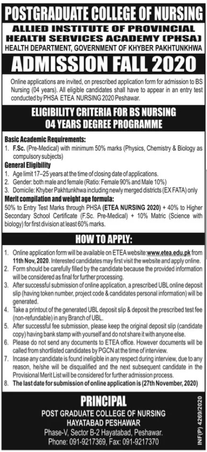 Postgraduate College of Nursing has invites the application forms of admission for BS Nursing 04 years program in Peshawar. The last date for submission of online application is 27th November 2020.