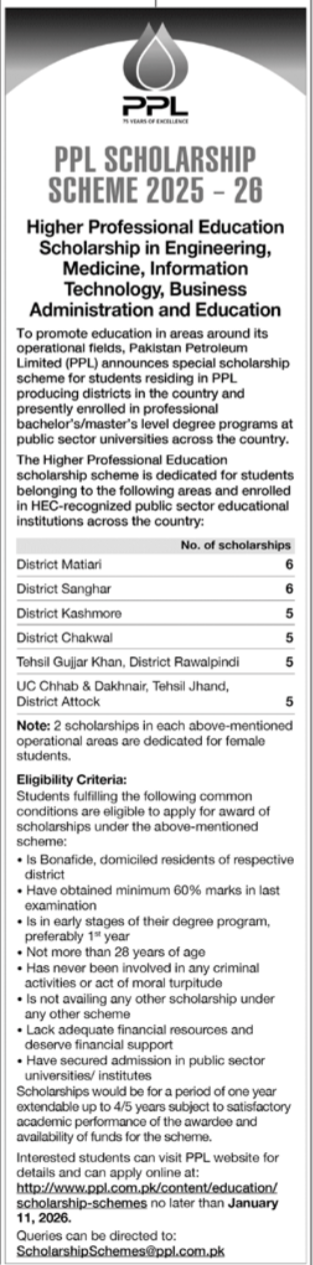 Pakistan Petroleum Limited PPL is committed to promoting education and supporting talented students in areas surrounding its operational fields. To this end, PPL is pleased to announce its Higher Professional Education Scholarship Scheme 2025-26 for students pursuing professional bachelors or masters level degrees in Engineering, Medicine, Information Technology, Business Administration, and Education at public sector universities across Pakistan.