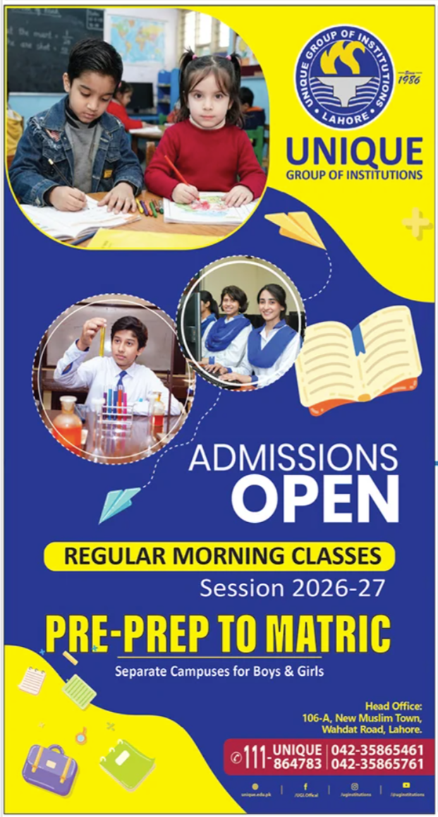 The Unique Group of Institutions, a leading educational network established in 1986, is now inviting applications for Regular Morning Classes for the 2026–27 academic session. The academy offers programs from Pre-Prep to Matric, providing a structured and quality education designed to nurture young learners and prepare them for academic success.