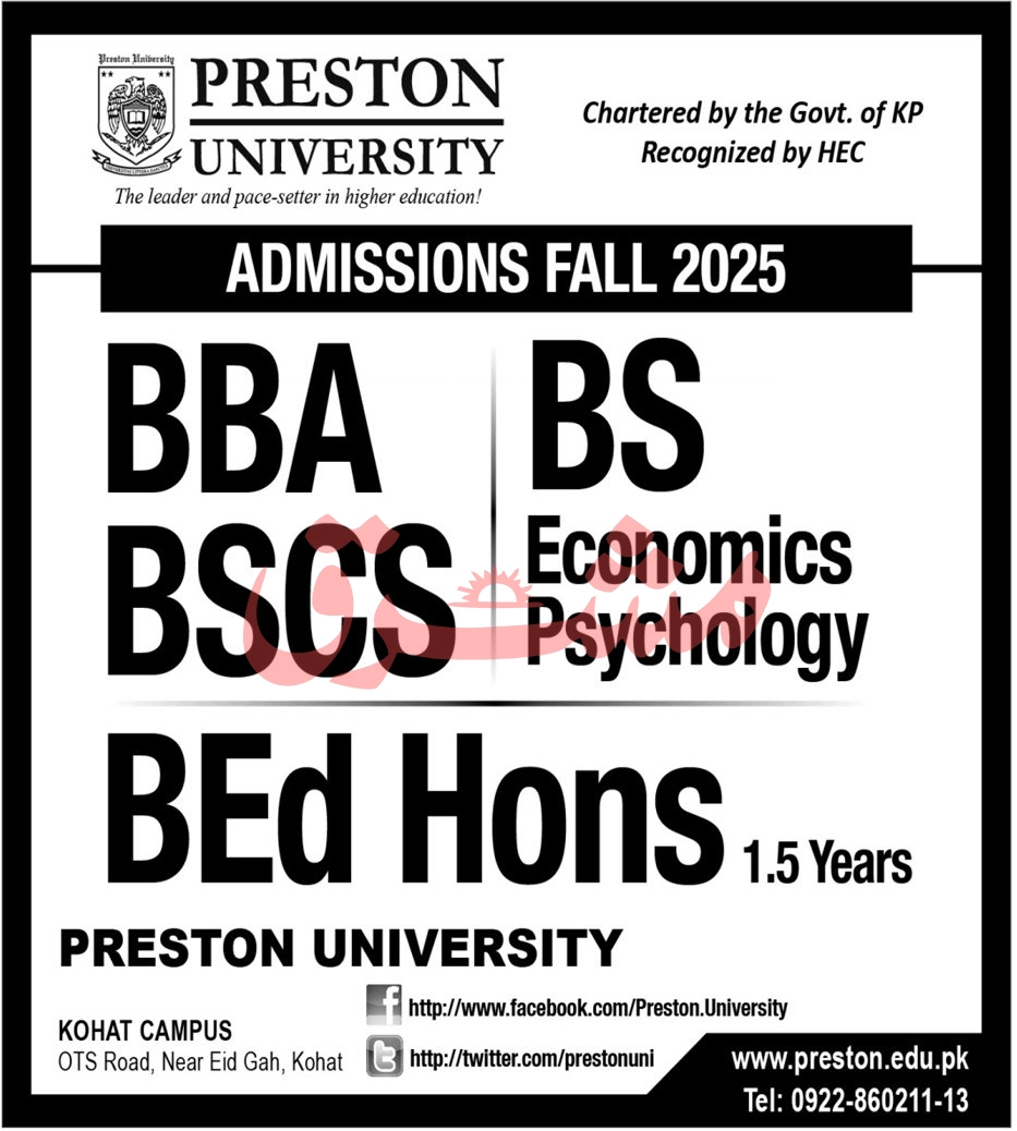 Preston University, chartered by the Government of Khyber Pakhtunkhwa and recognized by the Higher Education Commission HEC, proudly announces admissions for the Fall 2025 semester at its Kohat campus.
