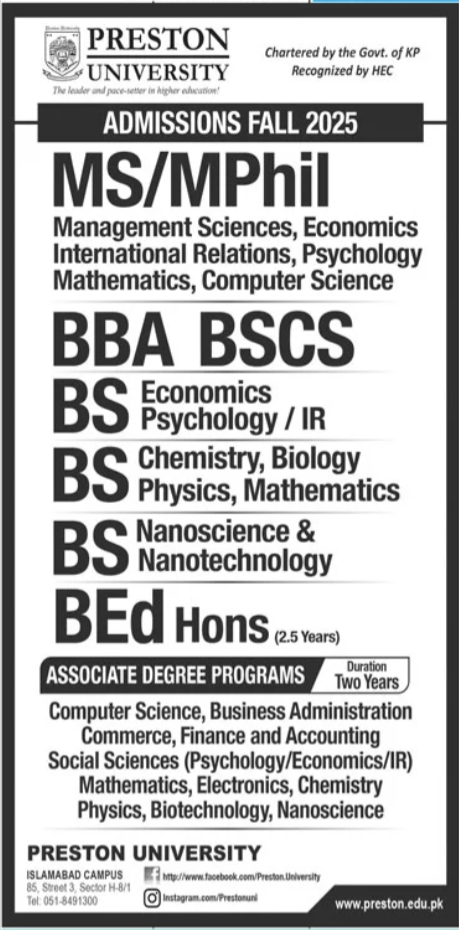 Preston University, a pioneer in quality higher education in Pakistan, invites applications for Fall 2025 admissions at its Islamabad Campus. Offering a wide range of undergraduate, graduate, and associate degree programs, Preston is committed to nurturing future leaders equipped with knowledge, innovation, and real-world skills.