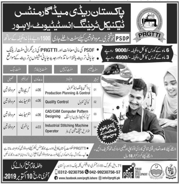 Pakistan Ready made Garments Technical Training Institute Lahore Admissions 2019