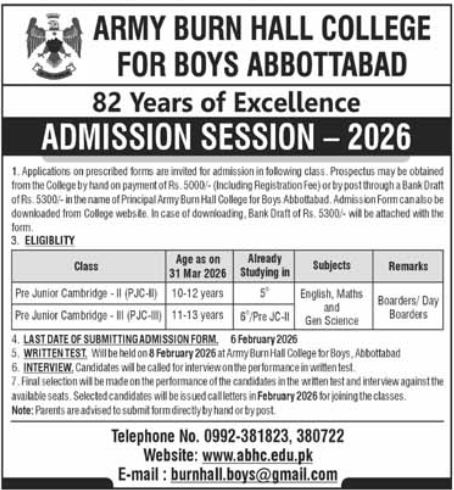 Army Burn Hall College for Boys Abbottabad has officially announced its admissions 2026, marking 82 years of academic excellence in the region. This prestigious institution is currently inviting applications for specific junior Cambridge levels, providing a structured pathway for young students to join a legacy of disciplined learning.