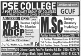 PSE College Lahore has offered admissions 2020-21 for MA in Education, Physical Education, MSc in Zoology, Chemistry, Psychology, Criminology, Advance Diploma in Clinical Psychology, MEd Last chance to enroll.
