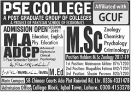 PSE College Lahore has offering admissions for MA in Education, English, Physical Education, MSc in Zoology, Chemistry, Psychology, Criminology, MEd. Admissions are open for session 2021.