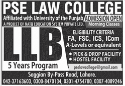 PSE Law College has given announcement of Admission in LLB (5 years Program).Eligibility Critera is F.A,F.Sc,Ics,ICom,A-Levels or equivalent.Admissions are open now.