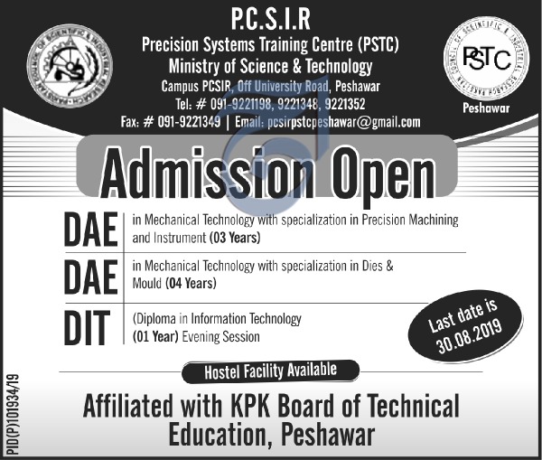 Precision Systems Training Center Peshawar has announced admissions for DAE in Mechanical Technology, Dies & Mould, Information Technology. Hostel facility is available. Last date for submission of admission forms is 30 Aug 2019.