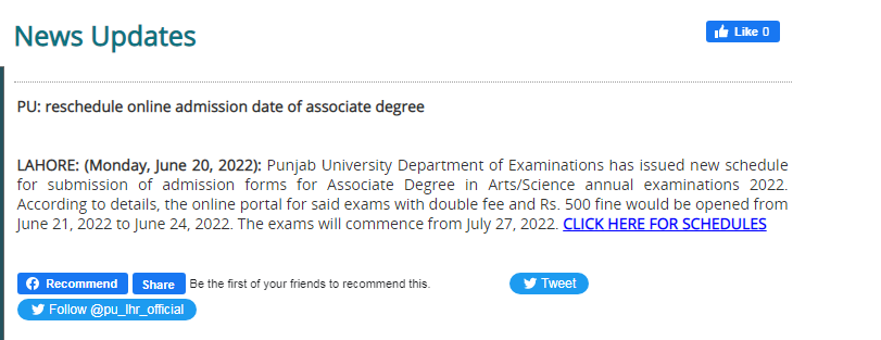 Lahore, University of the Punjab is going to start their PU ADA Annual Exams 2022 and PU ADS Annual Exams 2022. The exams section of Punjab University has announced their PU ADA ADS Annual Exams 2022 Online Admission Reschedule and they can submit their application forms with the payment of double fee with fine of Rs.500/- from 21-06-2022 to 24-06-2022. The candidates will also note that their PU Associate Degree Annual Exams 2022 will be started from 27-07-2022.