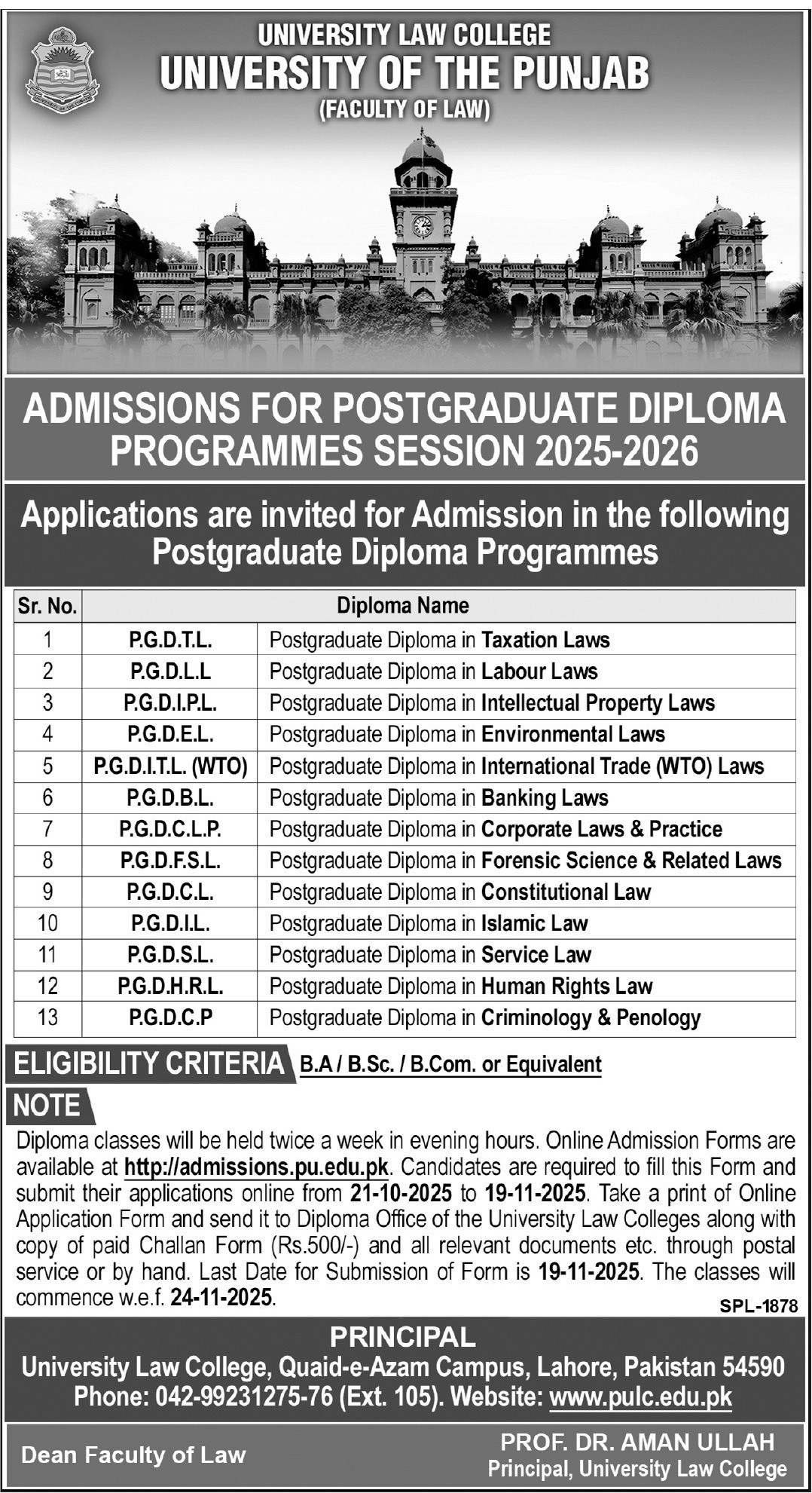 The University Law College, University of the Punjab PU, Lahore invites applications for admission into its Postgraduate Diploma Programmes for the academic session 2025–2026. These specialized diploma programmes are designed for graduates seeking to enhance their legal knowledge and professional expertise in various fields of law.