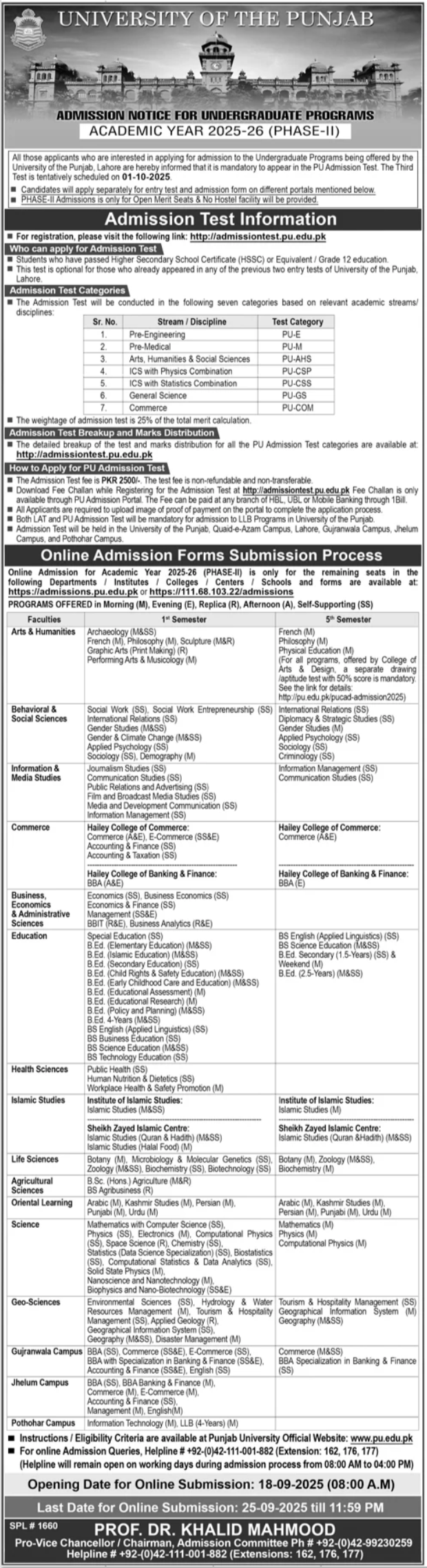 The University of the Punjab, Lahore PU invites applications for Undergraduate Programs Phase-II for the academic year 2025–26. This phase is for Open Merit Seats only, and no hostel facility will be provided.