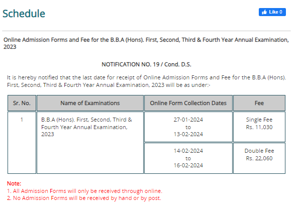 PU BBA Hons Annual Exams 2023 Online Forms Schedule