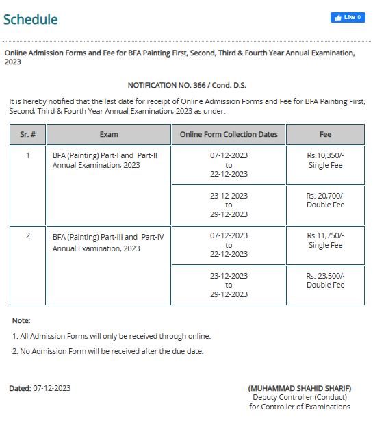 The candidates will note the date and time of the submission of their admission forms. The candidates are asked to forward their admission forms with singe fee payment from 07-12-2023 to 22-12-2023. The late candidates will have to submit their application forms with the double fee payment from 23-12-2023 to 29-12-2023. The students will note that the rate of the fee for first and second year is varied from the fee of the third and fourth year so they should deposit the admission fee accordingly.