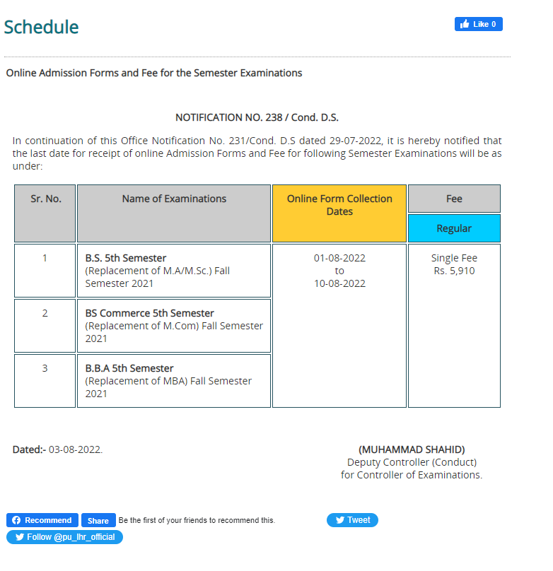Lahore, University of the Punjab is going to begin PU BS & BBA Fall Semester Exams 2022 for 5th semester and the students were advised to forward their application forms with payment of regular fee. The exams section of Punjab University issued their PU BS & BBA Fall Semester Exams 2022 Online Admission Forms Schedule and late college, private and improved division students will forward their application forms with payment of regular fee from 01-08-2022 to 10-08-2022 for PU BS & BBA Semester Fall Exams 2022. The candidates will also read the rate of the admission fee of BS and BBA classes, which are varied and they will pay the fee accordingly.