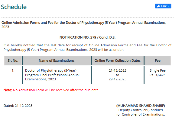 The students will forward their application forms with the payment of normal fee of Rs.3642/- from 21-12-2023 to 29-12-2023. The students will forward their application forms by following the complete schedule and they will also abide by the instructions of Punjab University at the time of filling the application forms and send it to the exams department.