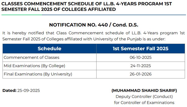The University of the Punjab has released the commencement schedule for the LL.B. 4-Year Program, 1st Semester Fall 2025 for its affiliated colleges. The students can get the fresh updates of PU Issues Class Schedule for LL.B. 4-Year Program – Fall 2025. The details are as follows:
