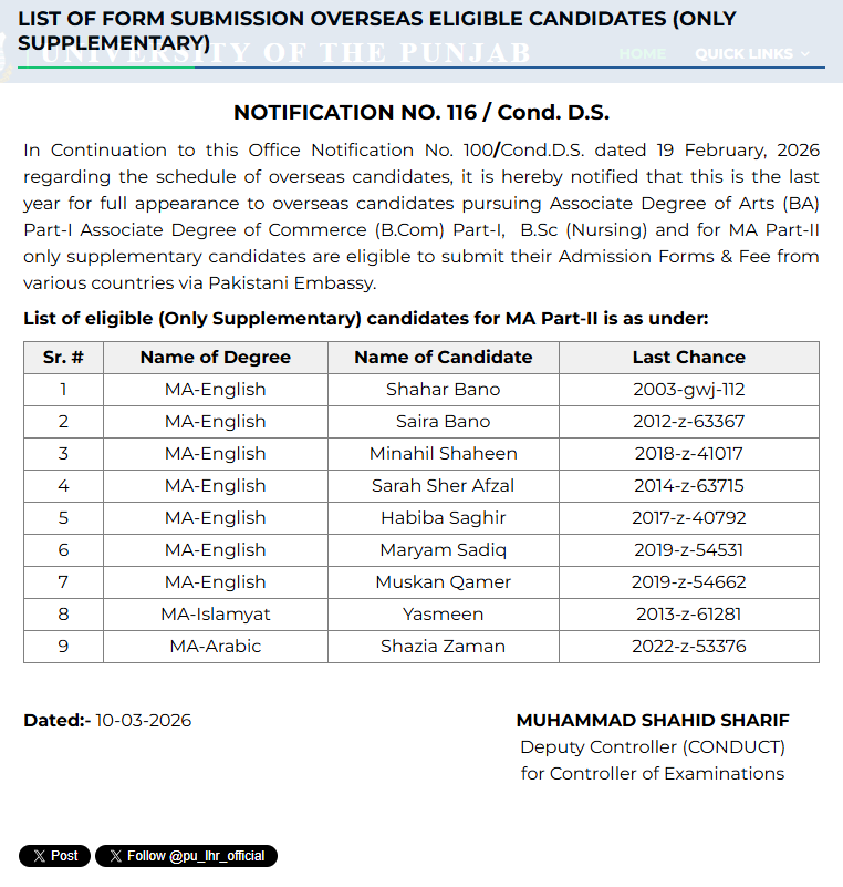 The Punjab University administration has clarified that this year will be the final opportunity for overseas candidates to appear fully in certain academic programs through this special arrangement. These programs include Associate Degree of Arts BA Part-I, Associate Degree of Commerce B.Com Part-I, B.Sc Nursing, and MA Part-II. However, in the case of MA Part-II, only those candidates who are appearing in the Supply category are permitted to submit their admission forms along with the required exam fee.