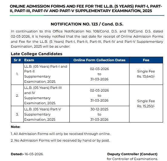 Punjab University has issued an official notification regarding the submission of online admission forms and payment of fees for the LL.B. 5-Year Supply exams for the year 2025. This announcement follows earlier notifications numbered 108/Cond. D.S. and 110/Cond. D.S., dated March 2, 2026. According to the latest update, students who intend to appear in the Supply exams for all five parts of the LL.B. program must complete their registration process within the revised schedule provided by the university. The students can check the latest updates of PU Online Registration Schedule for LL.B. 5-Year Supply Exams 2025.