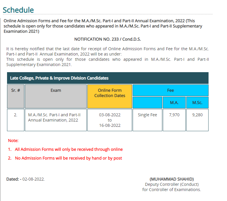 Lahore, University of the Punjab is going to start their PU MA & MSc annual exams 2022 for part 1 and 2 and the students were advised to forward their application forms with the payment of regular fee. The exams section of Punjab University has announced their PU MA & MSc Annual Exams 2022 Online Admission Forms Schedule and late college, private and improved division students can send their application forms with the payment of regular fee from 03-08-2022 to 16-08-2022 for PU MA & MSc Part I & II Annual Exams 2022. The candidates will also read the rate of the admission fee of MA and MSc classes, which are varied and they will pay the fee accordingly. Punjab University has started this admission process for those students, who have already appeared in PU MA & MSc Supply Exams 2021.