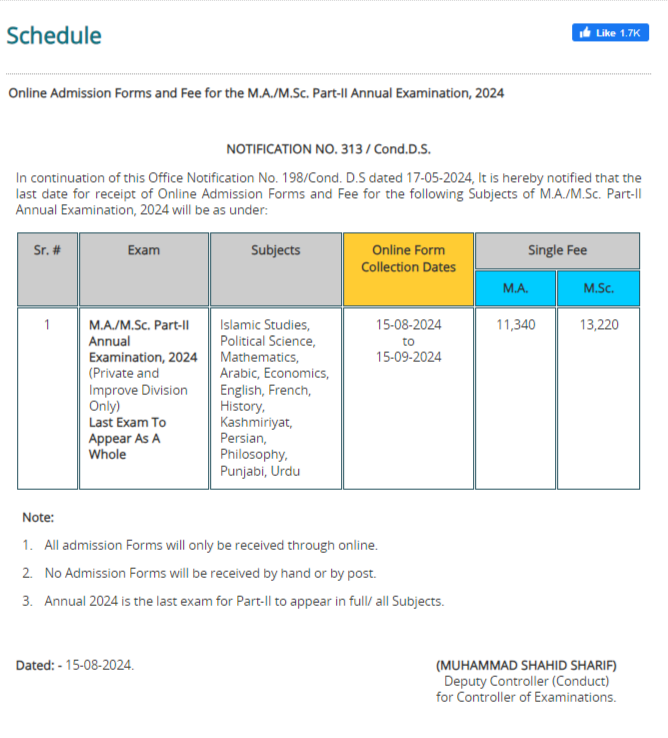 Additionally, Annual 2024 will be the final examination for Part-II students to appear in full/all subjects. Therefore, students are advised to complete their online admission forms within the given timeframe to avoid any late fees or complications.