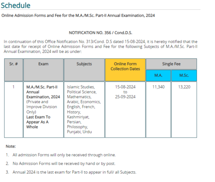 The single fee for the examination is set at 11,340 PKR for MA students and 13,220 PKR for MScstudents. It is important to note that all admission forms must be submitted online. The university will not accept forms submitted by hand or by post. This online submission process ensures a streamlined and efficient collection of admission details.