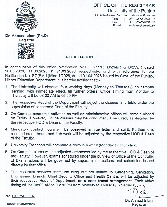 The Office of the Registrar at the University of the Punjab has issued a new directive, referring to earlier notifications dated 10.03.2026, 11.03.2026, and 31.03.2026, along with instructions from the Higher Education Department, Government of Punjab. The students can get the latest updates of PU Issues Revised Office and Academic Schedule.