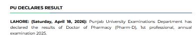 University of the Punjab, Lahore has officially released the result of the Doctor of Pharmacy Pharm-D First Professional Annual Examination 2025. According to an announcement of PU PharmD First Professional Exam Result was declared on Saturday, April 18, 2026, marking an important milestone for students who appeared in made on Saturday, April 18, 2026, by the university’s Exams Department, students who appeared in this professional assessment can now access their results. This declaration marks an important milestone for pharmacy students as they progress in their academic journey. Candidates are encouraged to check their results through the university’s official channels for detailed marks and performance status.