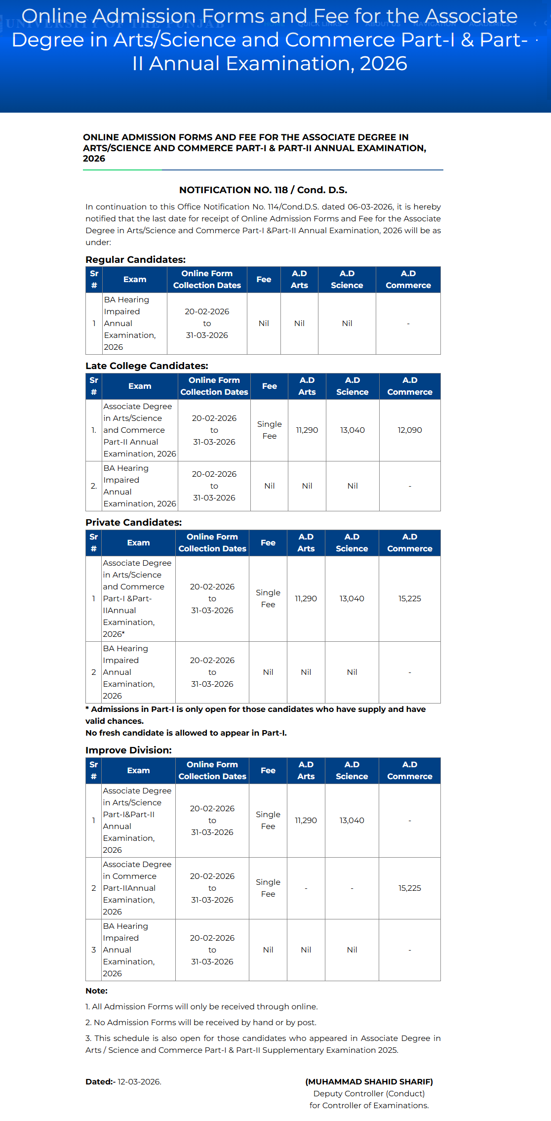 For regular candidates, the university has announced that candidates appearing in the BA Hearing Impaired Annual Exam 2026 can submit their online admission forms between February 20 and March 31, 2026. These candidates are not required to pay any exam fee for Associate Degree in Arts, Associate Degree in Science, or Associate Degree in Commerce.