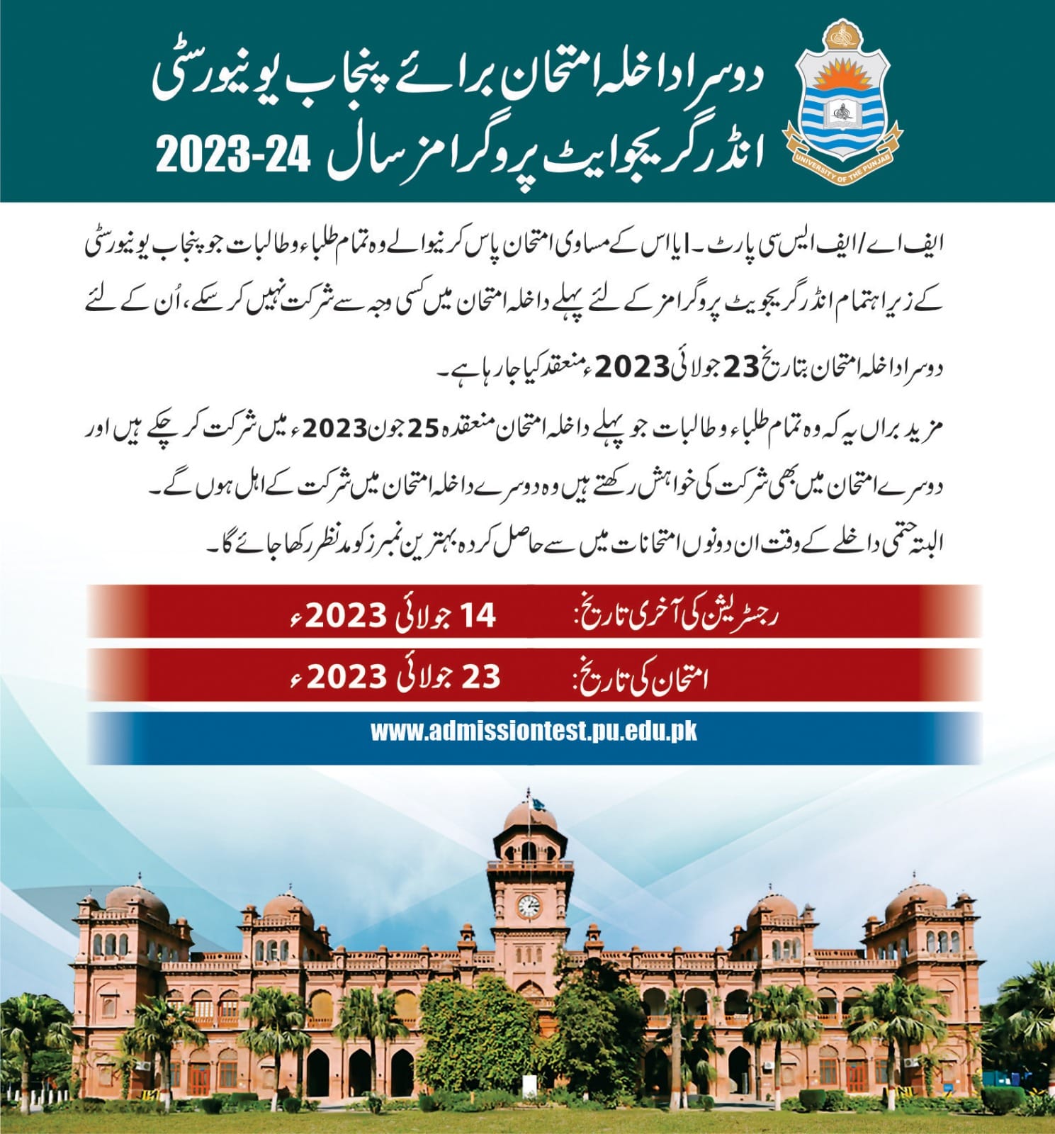 Lahore, University of the Punjab is going to grant admissions to the students in the undergraduate programs. The students, who passed their FA or FSc part 1 or equal exams, they applied for admission in the undergraduate programs being offered in Punjab University. The admission department conducted the admission exams of the applying candidates. Now Punjab University has announced their PU Undergraduate Program 2nd Admission Exams 2023-24 for the candidates, who could not appear in the first admission test. The second admission test will be managed on 23-07-2023. The candidates, who have already appeared in the first admission test and they want to appear in the second admission test, they can be eligible to appear in the 2nd admission test and their best score in these two exams will be considered.