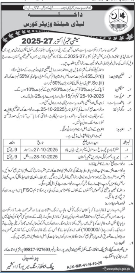 The Public Health Nursing School, Secretary Nuasti Mirpur, a sub-division of the Health Department, Azad Government of the State of Jammu & Kashmir, is now inviting applications for admissions 2025 for the 2-year Lady Health Visitor LHV Course for the session starting September-October 2025.