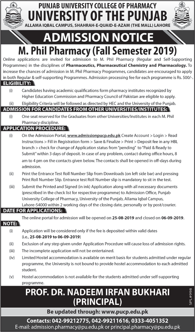 Punjab University College of Pharmacy Lahore has announced admissions for M.Phil in Pharmacy. Last date for submission of admission applications 06 Sep 2019.