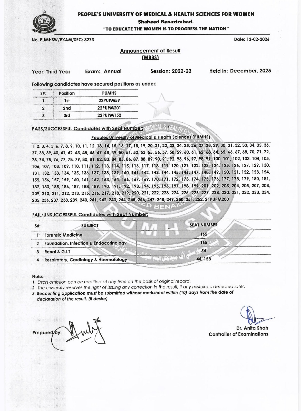 Medical students have eagerly been awaiting this moment, and now the wait is over as PUMHSW PEOPLE UNIVERSITY OF MEDICAL & HEALTH SCIENCES FOR WOMEN officially announces the MBBS Result 2026. The release of the PUMHSW MBBS result 2026 has generated significant attention among students and parents searching for the latest MBBS result updates and official examination outcomes.