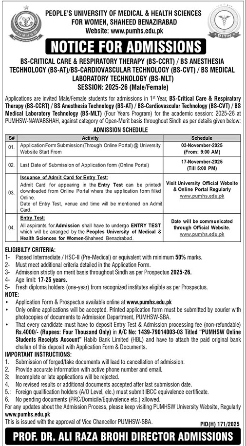 The Peoples University of Medical & Health Sciences for Women PUMHSW, Shaheed Benazirabad invites applications from male and female students for admission to the 1st Year of the following four-year BS programs for the academic session 2025-26.