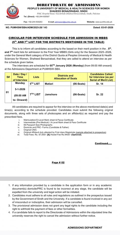 Peoples University of Medical & Health Sciences for Women PUMHSW, Shaheed Benazirabad, Directorate of Admissions, has issued a circular regarding the interview schedule for candidates selected in the 5th, 6th, and 7th merit lists for admission to the First Year MBBS Girls only for the Session 2025–2026. These admissions fall under the General Merit category of the District Quota.