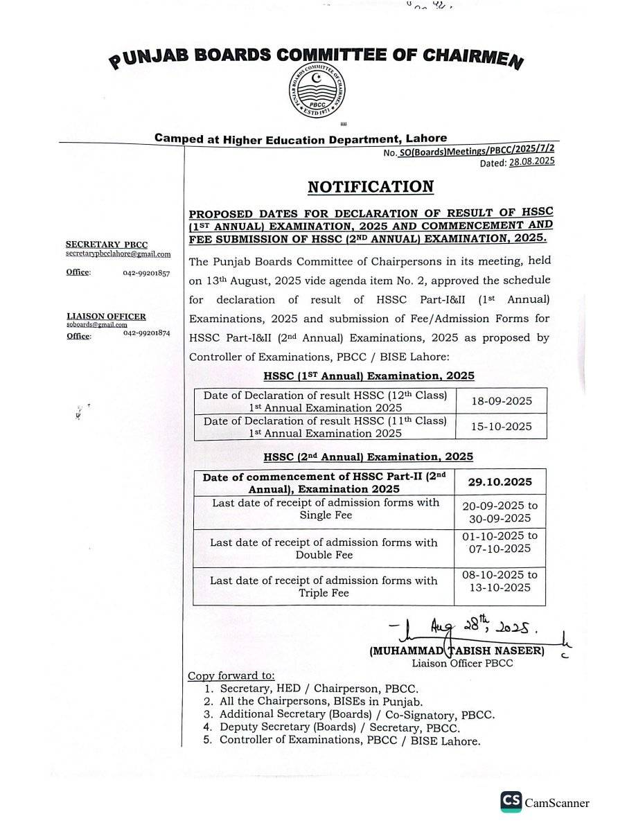 Lahore, Punjab Board Committee of Chairmen has announced the decision that the intermediate part 1 and 2 annual result will be announced as per scheduled date. The students will note that the Inter part 2 annual-I exams result 2025 will be declared on 18-09-2025 while the inter part 1 annual-I exams result 2025 will be announced on 15-10-2025. The students can get the latest updates of Punjab Boards HSSC Part I & Part II Result 2025 Date.