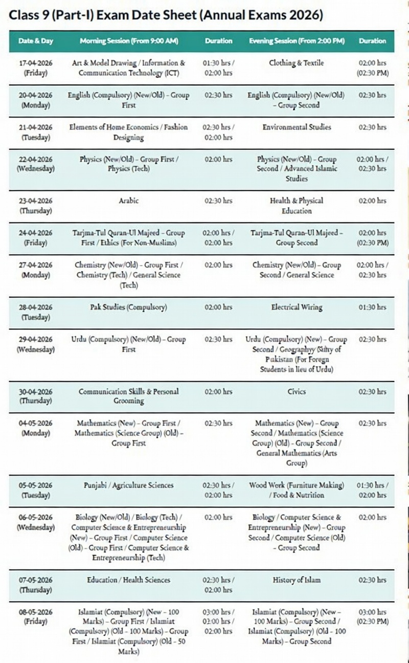 Punjab Boards Official 9th Class Annual Exam Date Sheet 2026