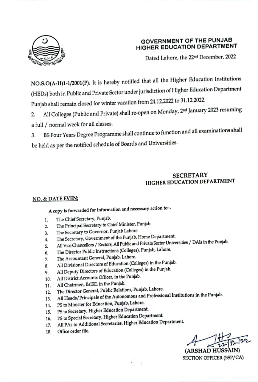 The Government of the Punjab has made the announcement of the winter vacations in the colleges and universities. The government made the announcement of Punjab Colleges & Universities Winter Vacations in the public and private sectors, which are operating under Higher Education Department. The colleges and universities will remain close from 24-12-2022 to 31-12-2022 and they will reopen on 02-01-2023. The Higher Education Institutes will carry on their BS programs as normal and the exams will be managed on the scheduled dates and time.