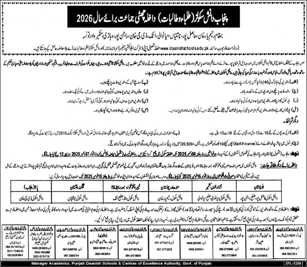 The Punjab Daanish Schools and Centres of Excellence Authority, Government of Punjab, invites applications for admission to Class 6 Sixth Grade for the academic year 2026 in the following campuses: