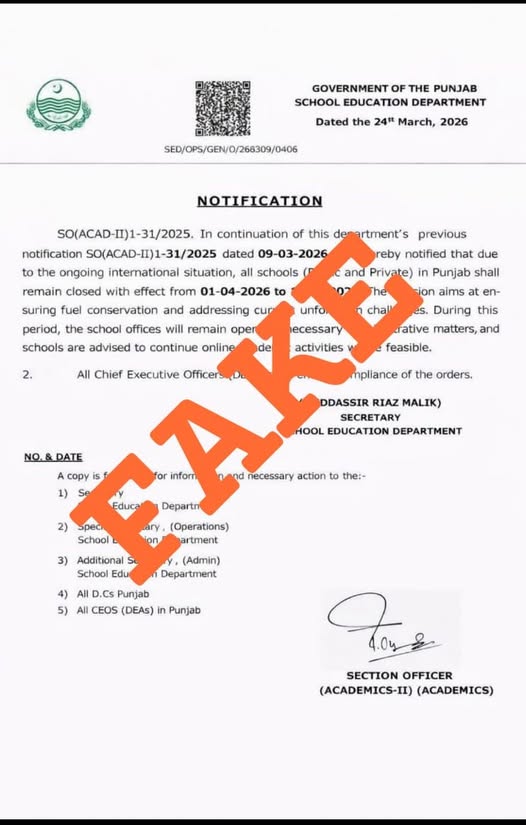 The School Education Department SED of Punjab has issued a high-alert clarification regarding a fraudulent notification currently circulating on social media. The "fake news" document, dated March 24, 2026, falsely claimed that all public and private schools across the province would be closed from April 1 to April 7, 2026, citing international tensions and fuel conservation. The provincial government has categorically denied these reports, confirming that no such school holiday extension has been approved.