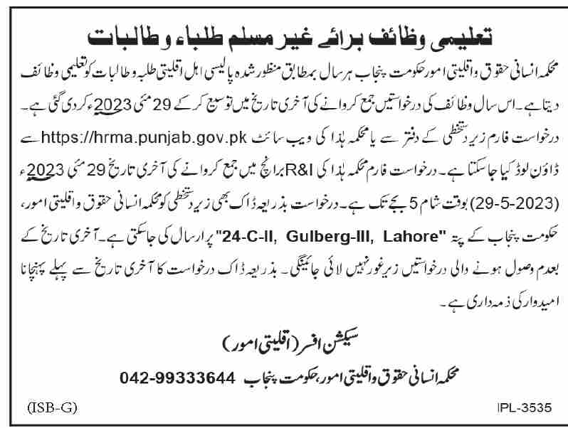 Human Resource and Minority Affairs Department of the Government of Punjab is pleased to announce the availability of scholarships for minority students. This initiative aims to support and empower students belonging to minority groups who are studying from Matric to Ph.D. levels. Selected deserving students will be awarded a fixed yearly stipend as a part of this scholarship program. The candidates can get the detailed information of Punjab Govt HRMA Minorities Scholarship 2023.