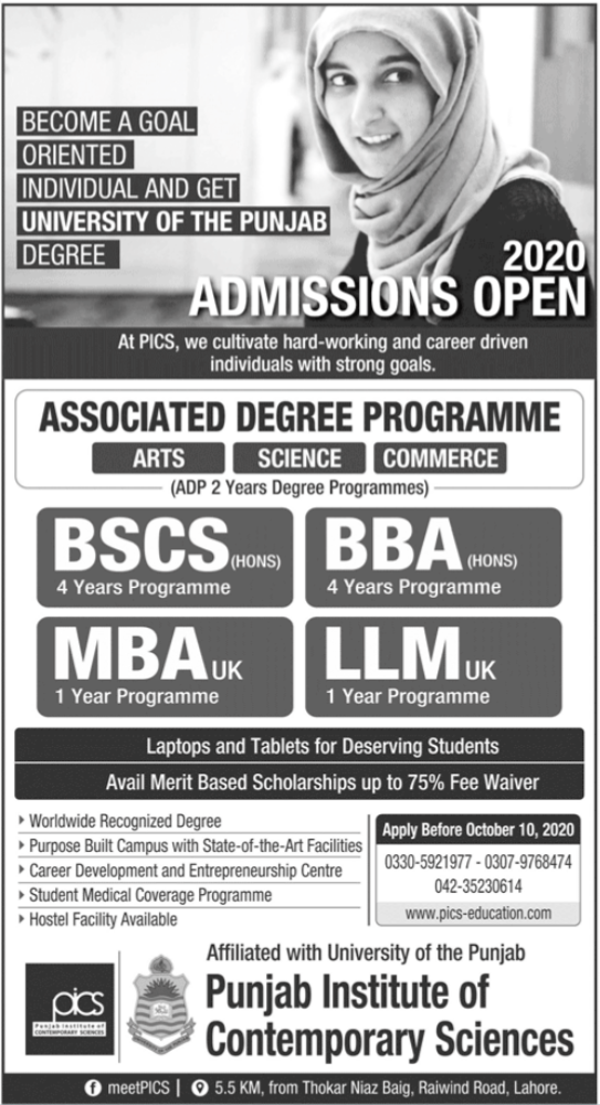 Punjab Institute of Contemporary Sciences has announced theadmissions 2020 in Undergraduate(BBA, BSCS) program and Postgraduate(MBA UK) program in Lahore. University also offering the LLM program.