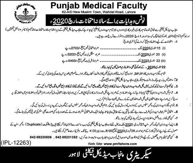 Punjab Medical Faculty Lahore has announced Notice for Annual Examinations March 2020 for those institutions who are affiliated from Punjab Medical Faculty. Last date for submission of applications for Examinations is 15 Jan 2020.