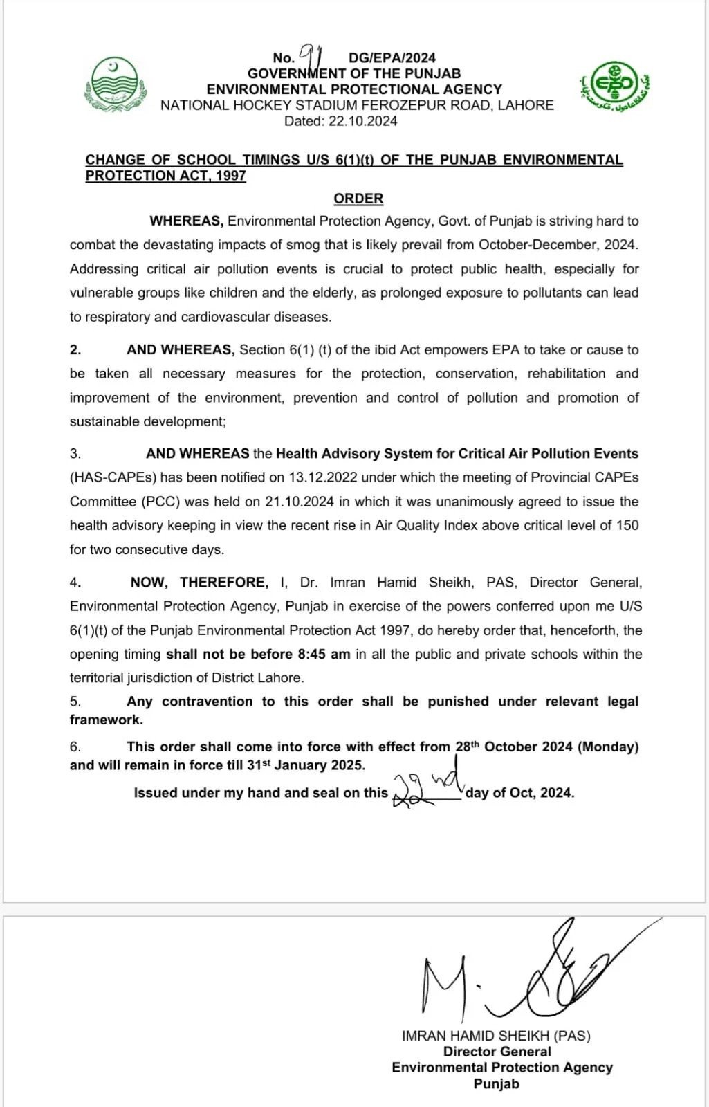 In addition to altering school schedules, PEPA has urged citizens to take preventive steps to reduce exposure to air pollution. People are advised to limit outdoor activities, especially physical exercise, and to keep windows and doors closed to avoid pollution intake. The authority also recommends wearing masks and ensuring vehicle fitness to help mitigate the risks of smog.