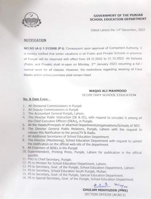 Lahore, The government of the Punjab, School Education Department of Punjab has announced the winter vacations in all schools and colleges located in Punjab province. Punjab School Education Department made the announcement of Punjab Schools & Colleges Winter Vacations. The educational institutes will remain close from 24-12-2022 to 31-12-2022 for the winter vacations and the schools and colleges will re-open from 02-01-2023 and the educational activities will be resumed in all of the schools and colleges in Punjab and students will attend their regular classes. The teaching and non-teaching staff and the students and their parents will note the duration of the winter vacations.