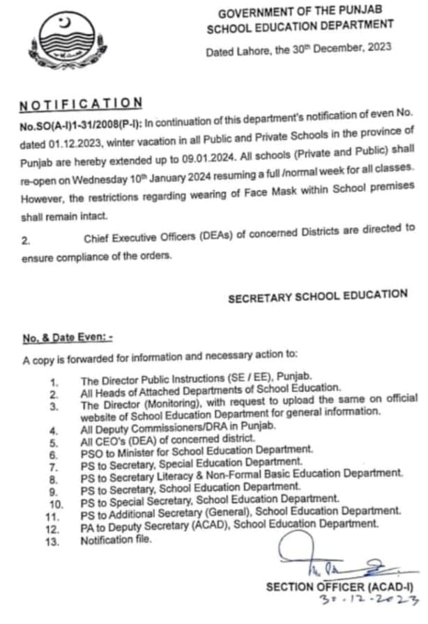 As outlined in an official notification issued by the education department, all public and private schools in Punjab will remain closed until January 9. The reopening date for educational institutions is set for January 10. The notification emphasizes the continued requirement for students and staff to wear face masks within school premises.