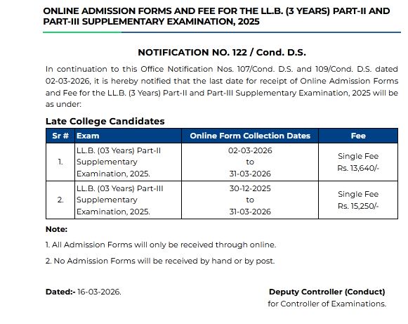 Punjab University has officially announced the schedule for submission of online admission forms along with the required fees for the LL.B. 3-Year Part-II and Part-III Supply exams for the year 2025. This notification has been issued in continuation of earlier announcements numbered 107/Cond. D.S. and 109/Cond. D.S., dated March 2, 2026. The updated schedule provides clarity for late college candidates who intend to appear in these Supply exams. The students can get the latest updates of PU Extends Online Registration for LL.B. 3-Year Supply Exams 2025.