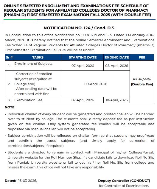 Punjab University has released an official notification outlining the schedule for online semester enrollment and exams fee submission for regular students of affiliated colleges enrolled in the Doctor of Pharmacy Pharm-D program for the First Semester Fall 2025 exams. This announcement has been issued as a continuation of earlier notifications numbered 99 and 121/Cond. D.S., dated February 19 and March 16, 2026. The new schedule specifically applies to candidates submitting their fees under the double fee category. The students can get the latest updates of PU Issues Double Fee Schedule for Pharm-D First Semester Fall 2025 Exams.