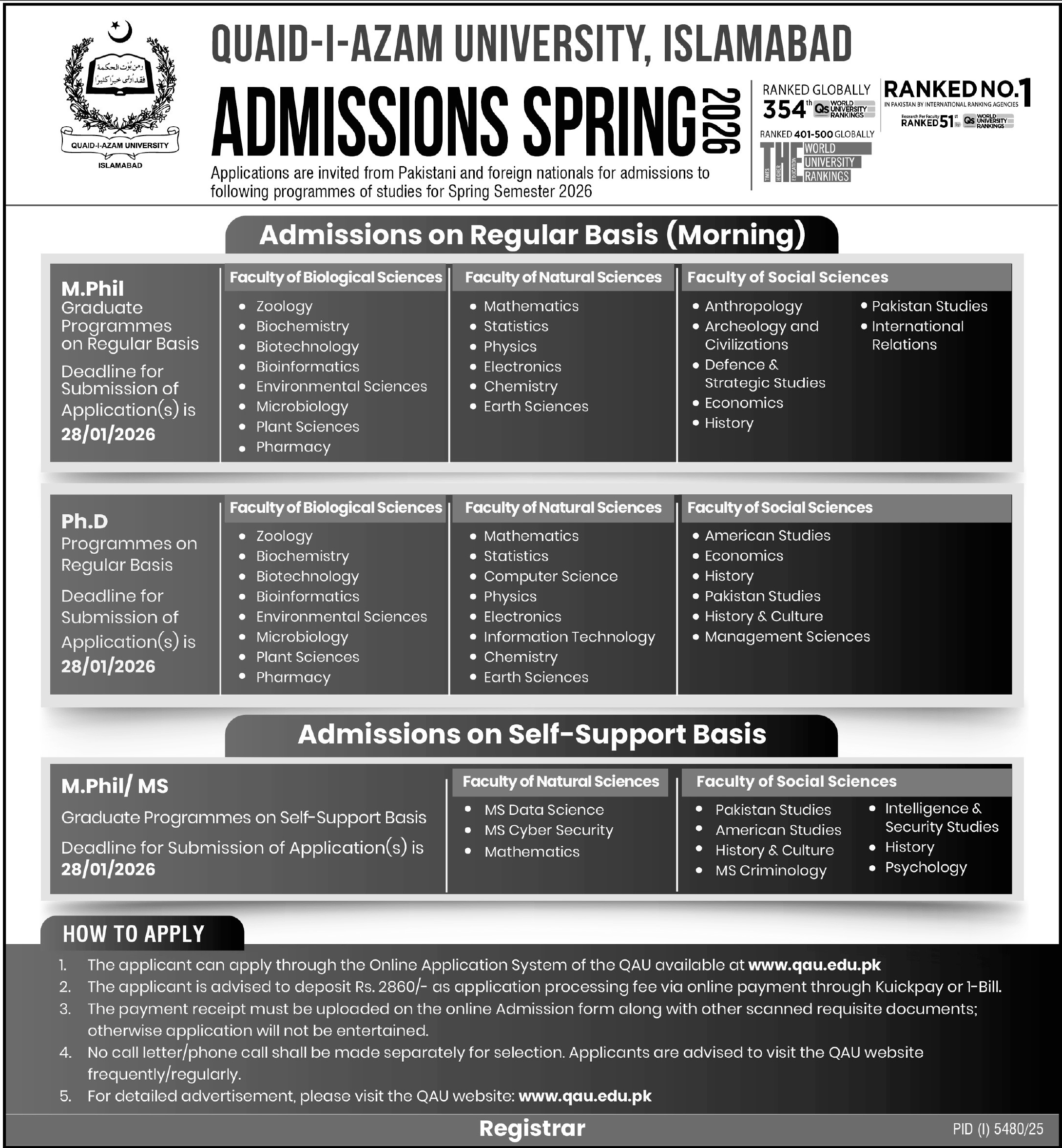 Quaid-i-Azam University QAU, Islamabad, invites applications from Pakistani and foreign nationals for admission to its M.Phil, Ph.D., and graduate programs on a regular and self-support basis for the Spring Semester 2026.